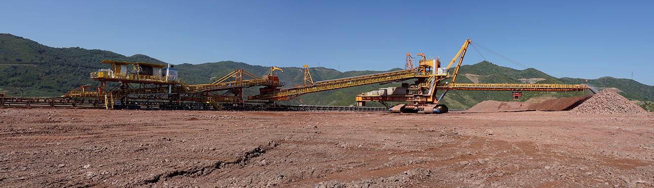 排土機(jī)位于大型露天礦山半連續(xù)開(kāi)采系統(tǒng)的末端,用于運(yùn)輸和排棄物料。排土機(jī)與卸料車(chē)協(xié)同工作:卸料車(chē)完成物料的提升,將物料傳送至排土機(jī)的受料皮帶上,排土機(jī)將卸料車(chē)輸送來(lái)的物料通過(guò)排料臂有序排棄至排土場(chǎng);排土機(jī)與卸料車(chē)互鎖聯(lián)動(dòng)完成排土作業(yè)。排土機(jī)按照排土工藝隨排土場(chǎng)的推進(jìn)而移動(dòng)。