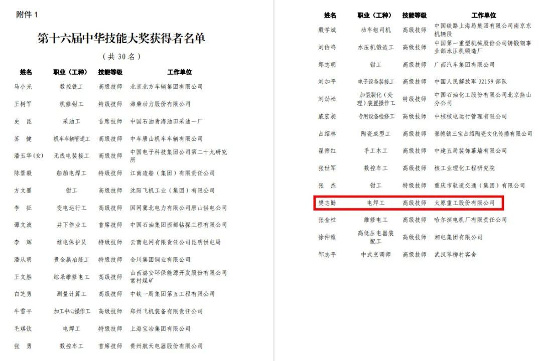 近日,第十六屆“中華技能大獎(jiǎng)”和“全國(guó)技術(shù)能手”名單出爐!全國(guó)僅30名中華技能大獎(jiǎng)獲得者,太重集團(tuán)高級(jí)技師樊志勤榜上有名,也是獲此殊榮的第一位太重人!衷心祝賀喜獲殊榮!