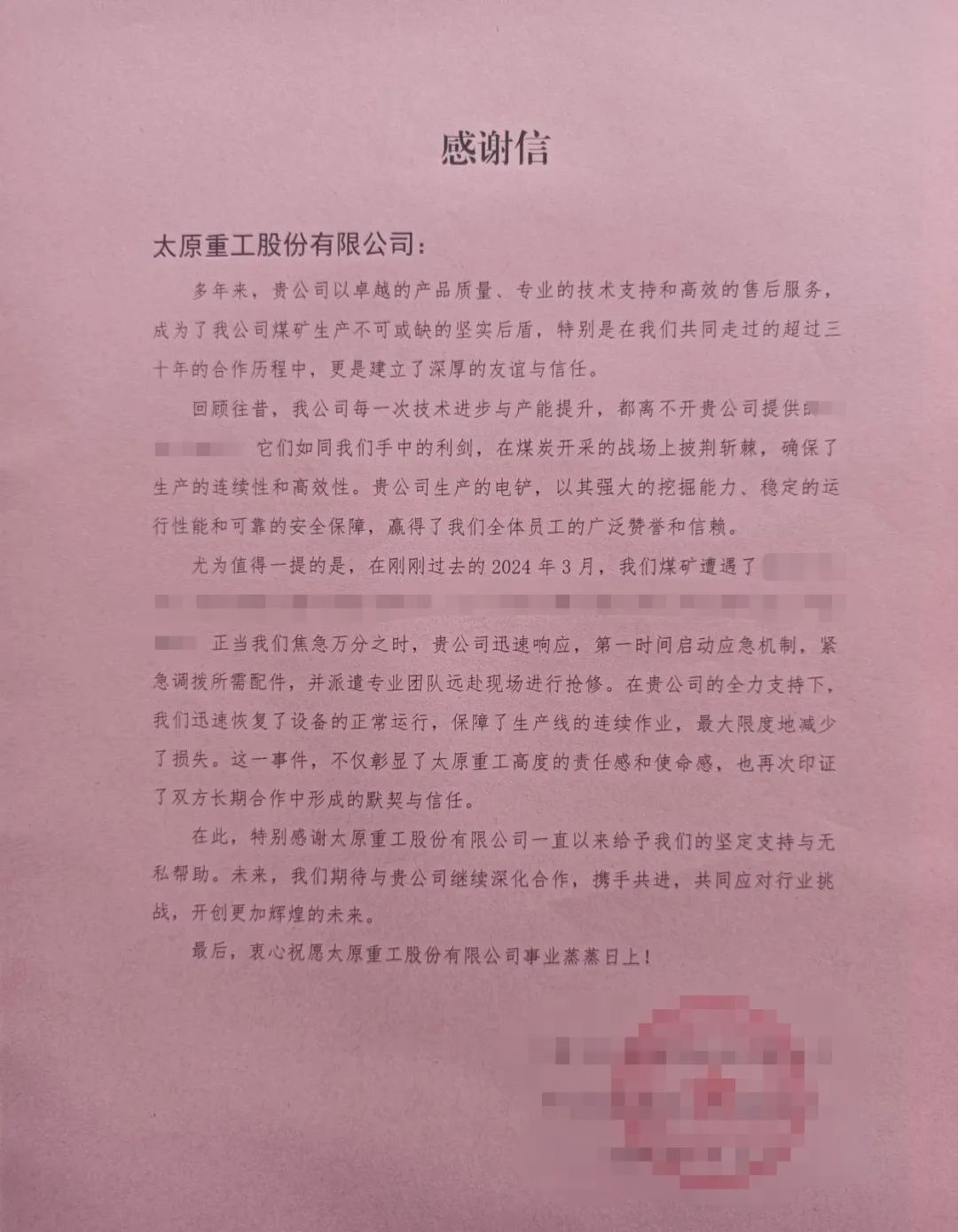 近日,太重收到一封來(lái)自合作三十多年內(nèi)蒙古用戶(hù)的感謝信,公司以精湛的制造工藝、卓越的產(chǎn)品性能以及貼心的售后服務(wù),贏得用戶(hù)高度認(rèn)可,成為用戶(hù)不可或缺的合作伙伴。