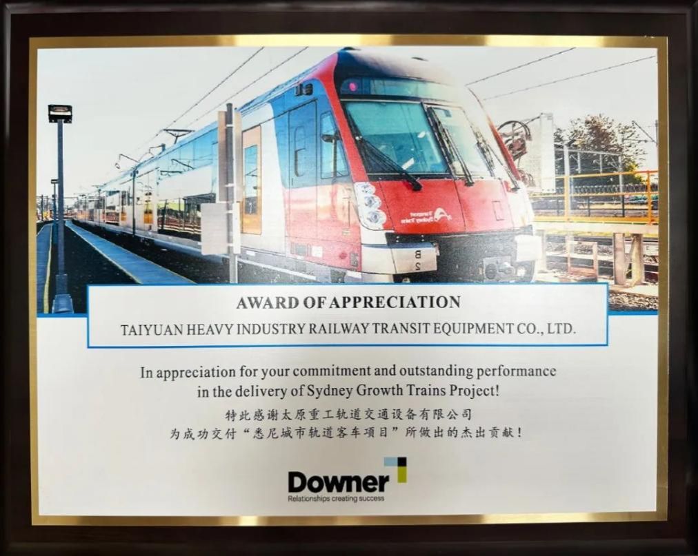 近日,公司收到一枚來自澳大利亞Downer公司的感謝獎(jiǎng)牌,對(duì)軌道公司為“悉尼城市軌道客車項(xiàng)目”成功交付做出的杰出貢獻(xiàn)表示感謝,為太重雄厚的技術(shù)和專業(yè)的服務(wù)點(diǎn)贊,并對(duì)未來的長(zhǎng)期合作表示期待。