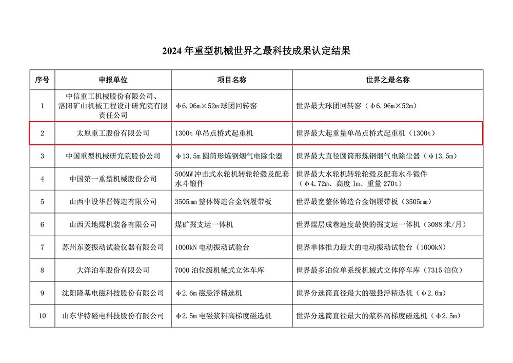 本次“重型機(jī)械世界之最科技成果”認(rèn)定,全國共有10項(xiàng)成果入選,要求項(xiàng)目突破關(guān)鍵技術(shù)壁壘,達(dá)到或超過國際先進(jìn)水平,并至少有一項(xiàng)關(guān)鍵技術(shù)指標(biāo)創(chuàng)造同類產(chǎn)品的世界之最。太重1300t橋式起重機(jī)榮登世界之巔,背后是“共和國長子”深耕起重機(jī)領(lǐng)域數(shù)十年的深厚積淀,也是太重科技工作者矢志創(chuàng)新、重器報(bào)國的不懈追求,充分展示了太重在起重機(jī)領(lǐng)域無可爭議的領(lǐng)先地位,也為我國大型起重機(jī)的設(shè)計(jì)制造蹚出了一條新路。