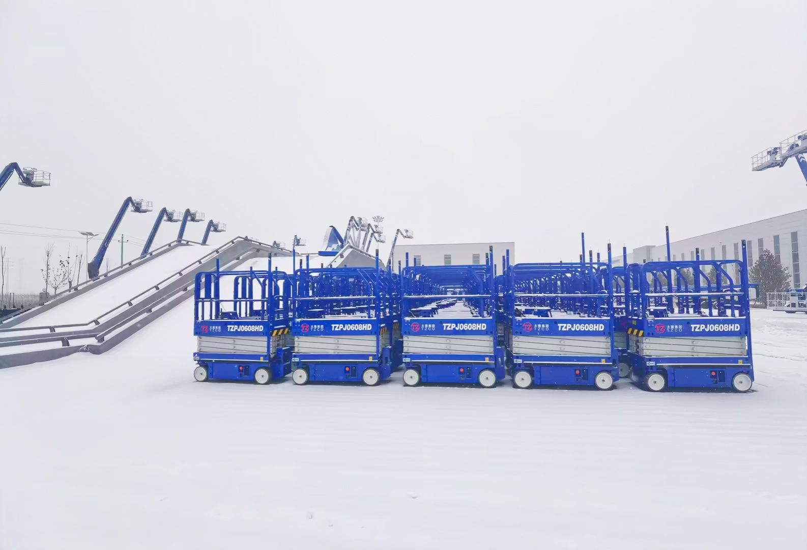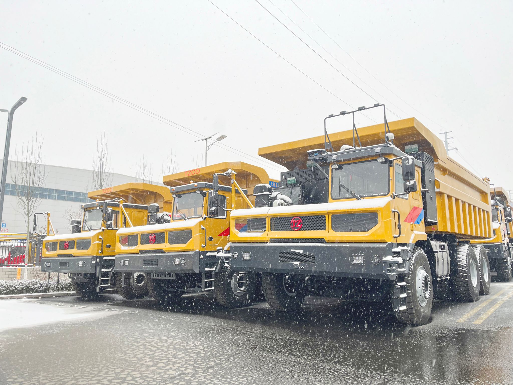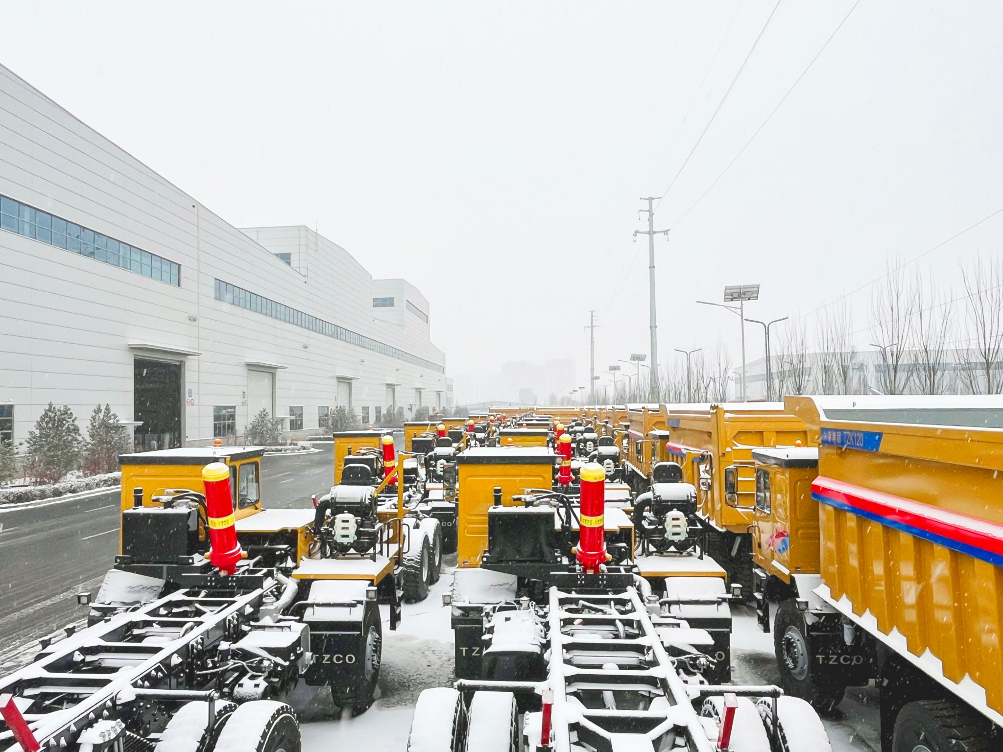 白雪皚皚間,一臺(tái)臺(tái)整裝待發(fā)的艷麗產(chǎn)品默然矗立,宛如彩塑靜立于純白畫卷。