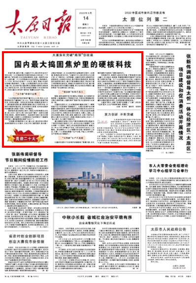 9月14日,太原日報頭版頭條《喜迎二十大》專欄,刊發(fā)文章《太重焦化突破“瓶頸”創(chuàng)效益 國內(nèi)最大搗固焦?fàn)t里的硬核科技》,報道太重集團(tuán)聚焦“雙碳”目標(biāo),加快培育能源科技創(chuàng)新領(lǐng)域新路徑,從具備制造國際先進(jìn)水平焦?fàn)t機械成套設(shè)備能力,到首開“一鍵煉焦”技術(shù)先河,再到研發(fā)出全國最大的智能搗固焦?fàn)t設(shè)備,“核心技術(shù)”的自主創(chuàng)新和“卡脖子”問題的逐個攻破,推動了我國焦化裝備制造在國際市場上從跟跑、并跑到領(lǐng)跑的跨越。