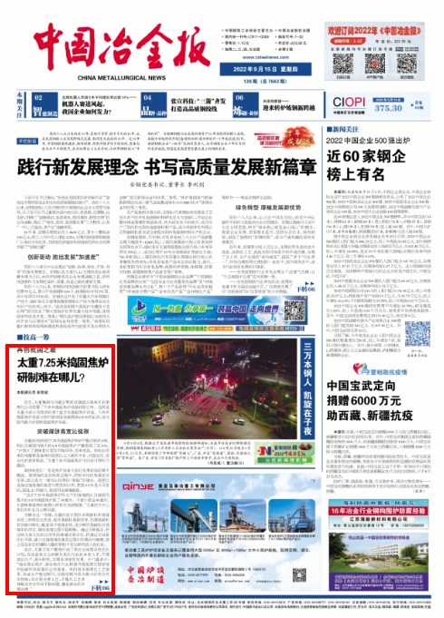 9月15日,中國(guó)冶金報(bào)頭版以《太重7.25米搗固焦?fàn)t研制難在哪兒?》為題,重點(diǎn)報(bào)道太重集團(tuán)聚焦“雙碳”目標(biāo),充分發(fā)揮高端裝備制造領(lǐng)域的豐富經(jīng)驗(yàn)和技術(shù)優(yōu)勢(shì),成功研制7.25米搗固焦?fàn)t設(shè)備,打破我國(guó)此前最高6.8米的紀(jì)錄,成為國(guó)內(nèi)最大的智能搗固焦?fàn)t設(shè)備。