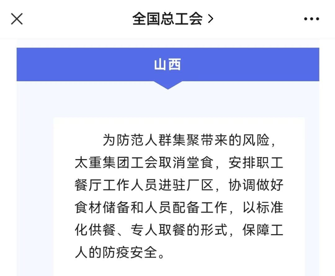 為防范人群集聚帶來的風(fēng)險(xiǎn),太重集團(tuán)工會取消堂食,安排職工餐廳工作人員進(jìn)駐廠區(qū),協(xié)調(diào)做好食材儲備和人員配備工作,以標(biāo)準(zhǔn)化供餐、專人取餐的形式,保障工人的防疫安全。