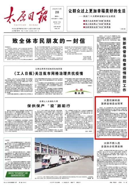 11月28日,太原日報(bào)頭版以《太重挖掘機(jī)獲國家級制造業(yè)冠軍》為題對太重集團(tuán)進(jìn)行報(bào)道。深化改革以來,太重集團(tuán)深耕重型裝備領(lǐng)域,擔(dān)當(dāng)高端裝備制造“鏈主”責(zé)任,加大前沿技術(shù)研發(fā)和關(guān)鍵核心技術(shù)攻關(guān)力度,加快轉(zhuǎn)型升級步伐,為公司高質(zhì)量高速度發(fā)展提供“硬核”力量。