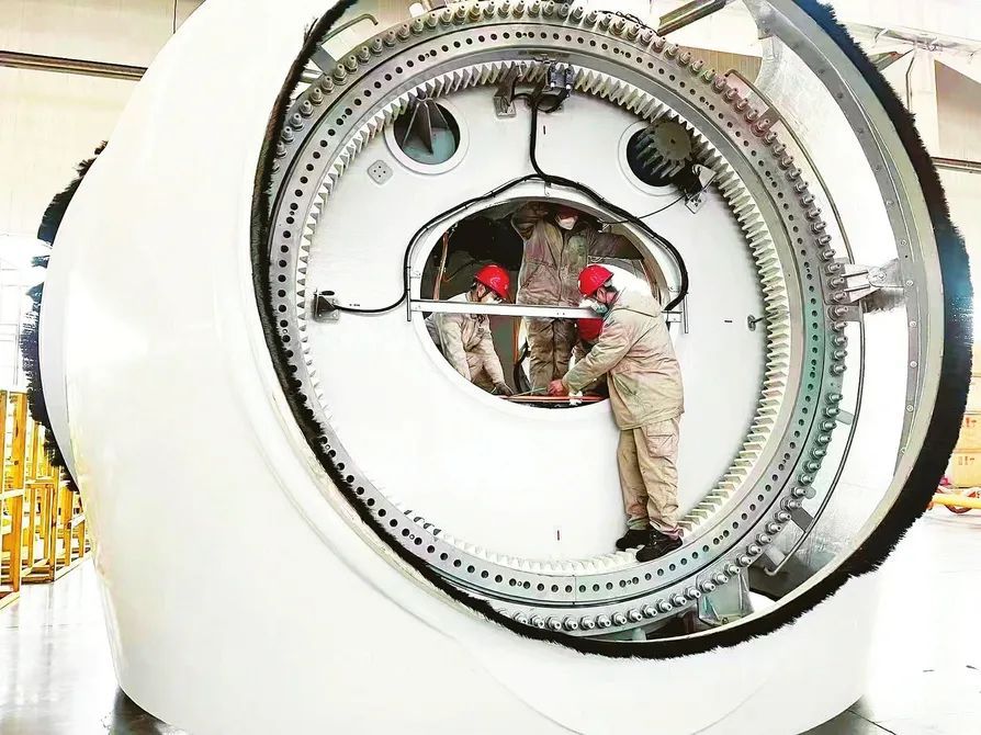 新能源公司風(fēng)電整機(jī)裝配車(chē)間內(nèi),裝配工正在進(jìn)行輪轂內(nèi)裝作業(yè)