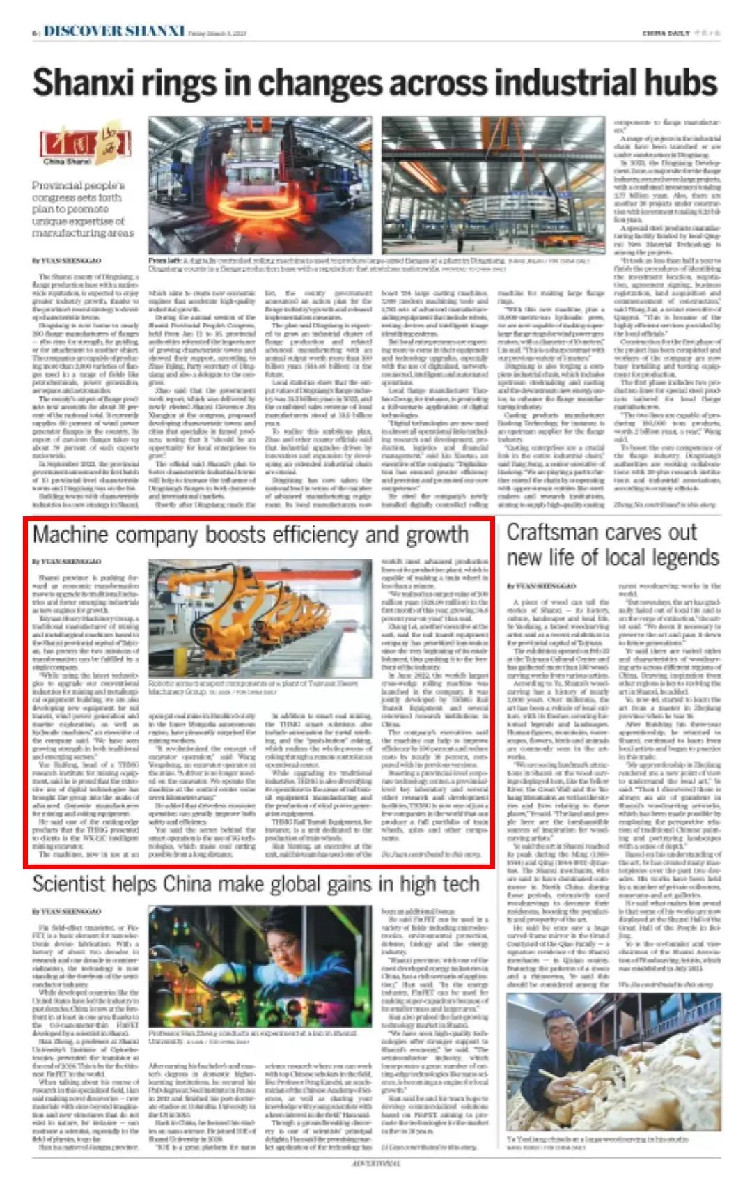 今日,中國日報全英文刊發(fā)《Machine company boosts efficiency and growth》文章,報道太重集團立足公司產(chǎn)業(yè)優(yōu)勢,聚焦智能礦用挖掘機、軌道交通等領域,推進智能設計、智能制造、智能產(chǎn)品、智能服務,持續(xù)提升重型裝備制造業(yè)的技術含量,積極在全省轉型發(fā)展中發(fā)揮龍頭帶動作用,助力我省建設中部地區(qū)先進制造業(yè)基地和數(shù)字經(jīng)濟發(fā)展新高地,在不斷推動產(chǎn)業(yè)形態(tài)轉型升級中勇立新功。