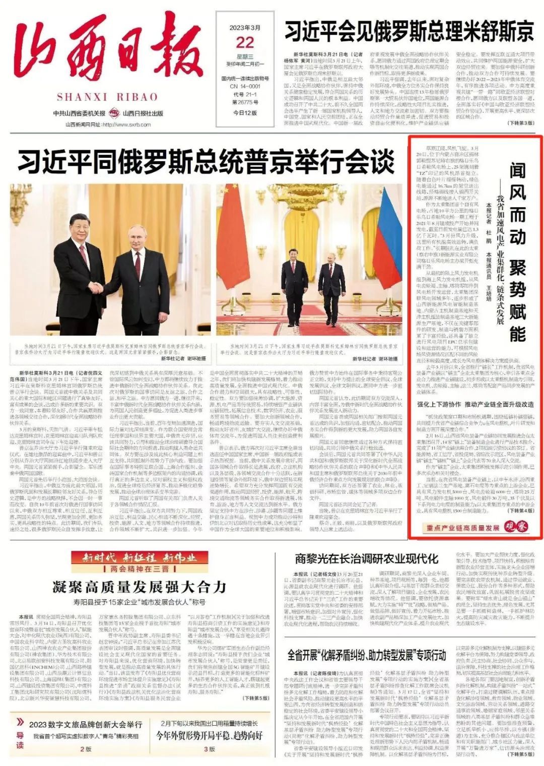 今天,山西日報頭版“重點產(chǎn)業(yè)鏈高質(zhì)量發(fā)展觀察”專欄,以“我省風電產(chǎn)業(yè)集群化、鏈條式發(fā)展”為題,報道了太重集團聞風而動、聚勢賦能,發(fā)展壯大風電產(chǎn)業(yè)鏈、創(chuàng)新鏈、價值鏈的生動實踐。