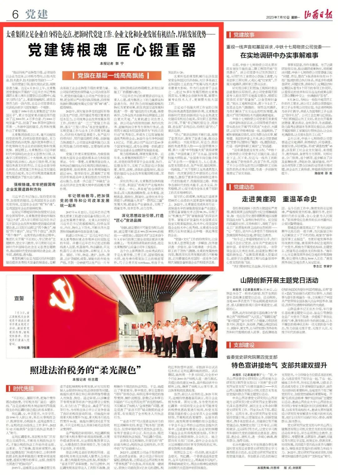 今天,山西日?qǐng)?bào)刊發(fā)《黨建鑄根魂 匠心鍛重器》文章,聚焦太重集團(tuán)以習(xí)近平新時(shí)代中國(guó)特色社會(huì)主義思想為指引,認(rèn)真學(xué)習(xí)貫徹黨的二十大精神,充分發(fā)揮黨組織政治核心、政治引領(lǐng)作用,扛起建設(shè)先進(jìn)文化的責(zé)任,立足企業(yè)自身特色和亮點(diǎn),把新時(shí)代黨建工作和企業(yè)文化建設(shè)有機(jī)結(jié)合起來,實(shí)現(xiàn)高質(zhì)量高速度發(fā)展,向著建設(shè)具有國(guó)際一流競(jìng)爭(zhēng)力的現(xiàn)代智能裝備制造企業(yè)目標(biāo)闊步邁進(jìn)。