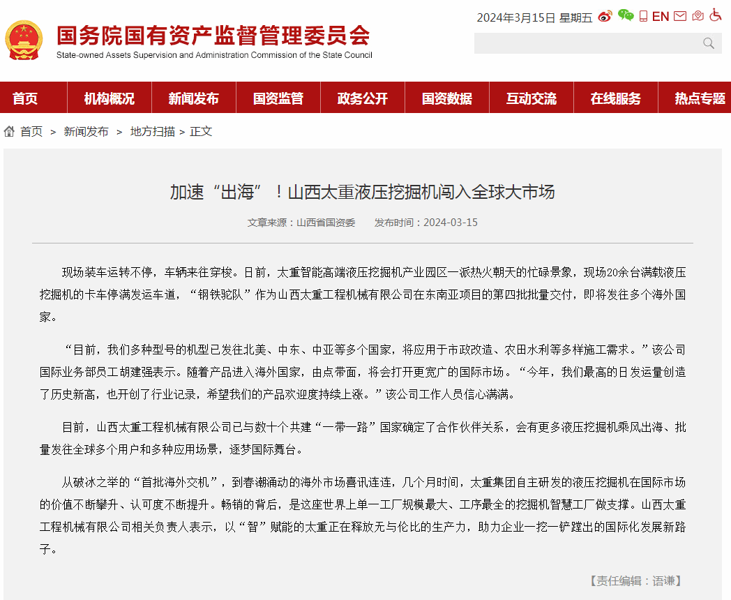 作為裝備制造業(yè)的領(lǐng)軍企業(yè),太重被格外關(guān)注,被寄予厚望。近日,國務院國有資產(chǎn)監(jiān)督管理委員會官網(wǎng)刊登了《加速“出海”!山西太重液壓挖掘機闖入全球大市場》;山西新聞聯(lián)播也在《推動高質(zhì)量發(fā)展 深化全方位轉(zhuǎn)型》欄目中對太重進行深入報道。