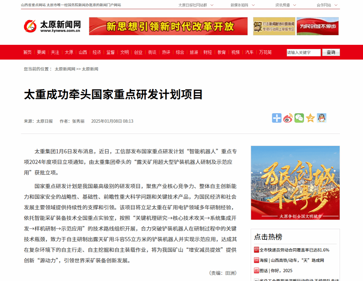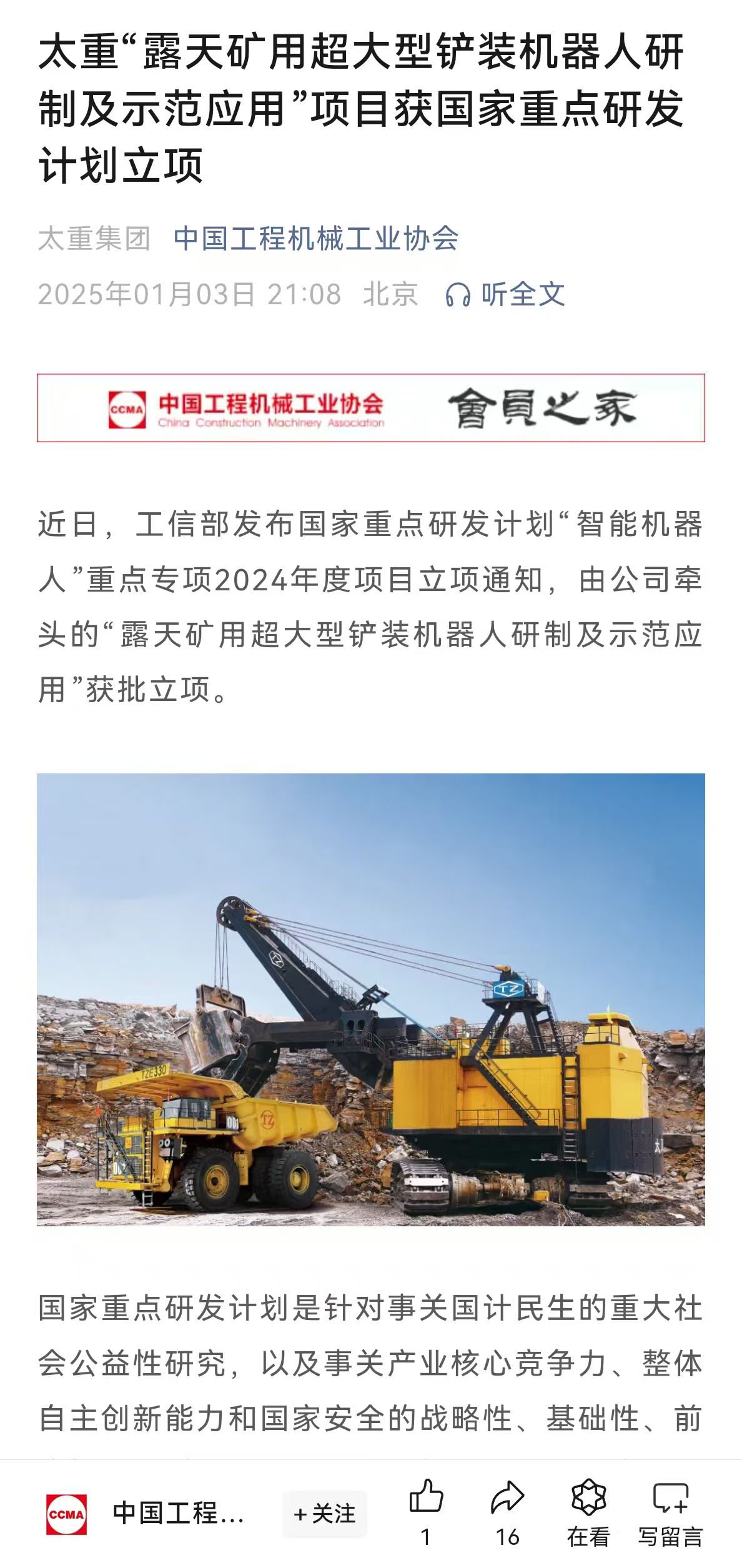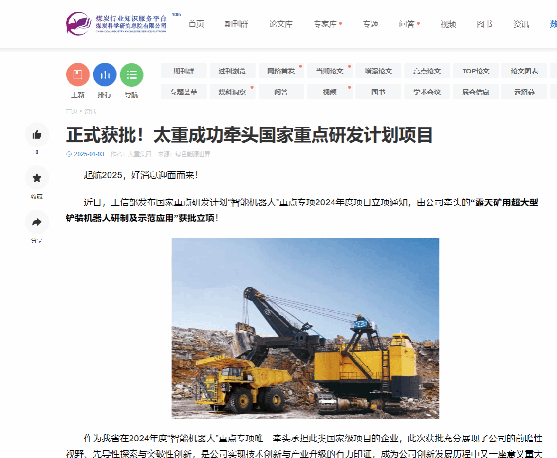 助力我國智慧礦山建設,太重在行動!近日,2024年度國家重點研發(fā)計劃立項結果公布,公司牽頭的“露天礦用超大型鏟裝機器人研制及示范應用”獲批立項!太重集團官微發(fā)布這一消息后,立刻受到人民日報的重磅關注,彰顯出國家對太重科技創(chuàng)新能力的高度認可。
